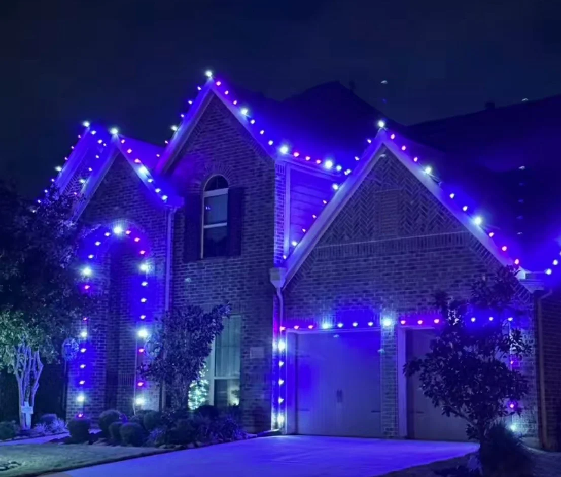 Hello and welcome to our little gallery of Holiday Cheer! Below are some examples of some of the different color schemes we can provide for your home. We use commercial grade socket wire and the big C9 Bulbs which are LED. We have to make up the light strings already by hand (screw in the bulbs) so why not choose a color that will make your own winter wonderland. The cool thing is, there are no extra cost associated with which colors you go with! The colors we do carry are the traditional warm white, bright white, and any color of the rainbow. Red, Orange, Yellow, Green, Blue, Purple, and Pink